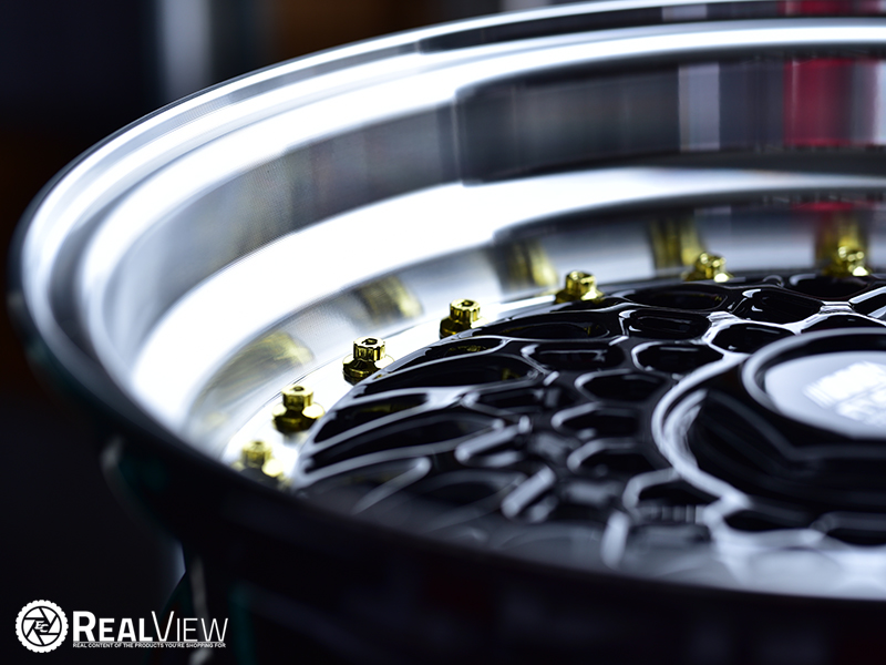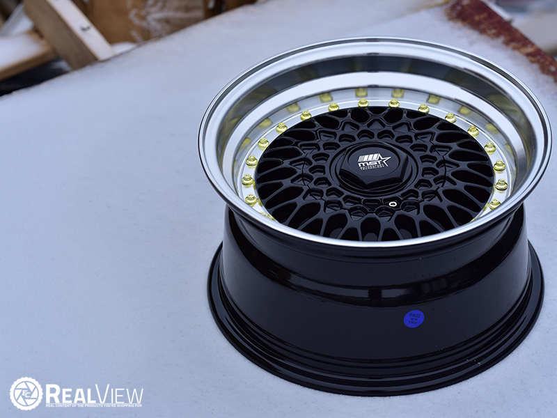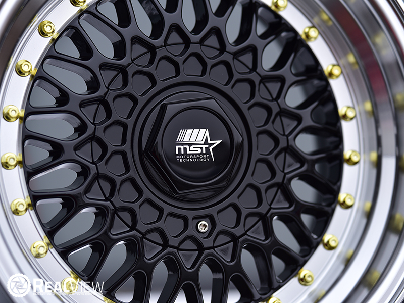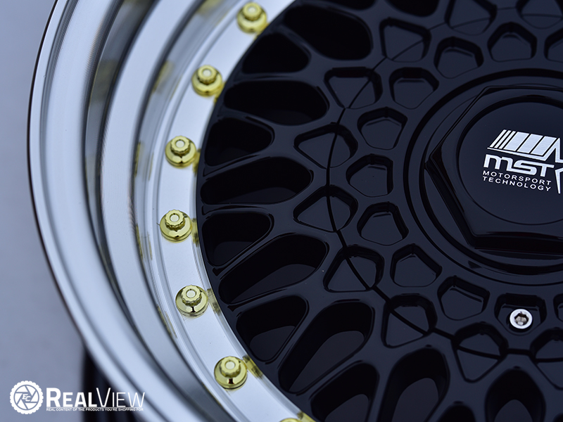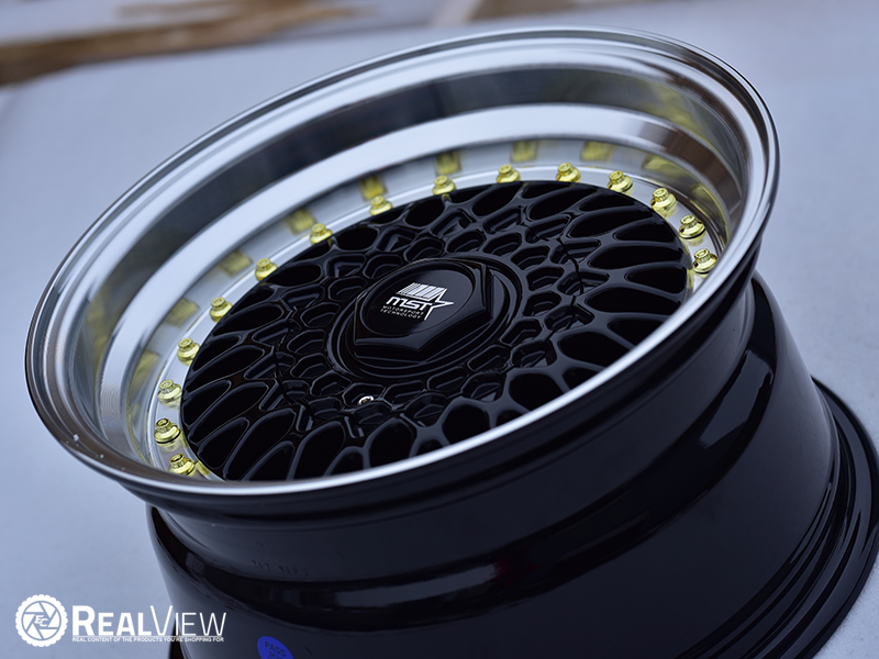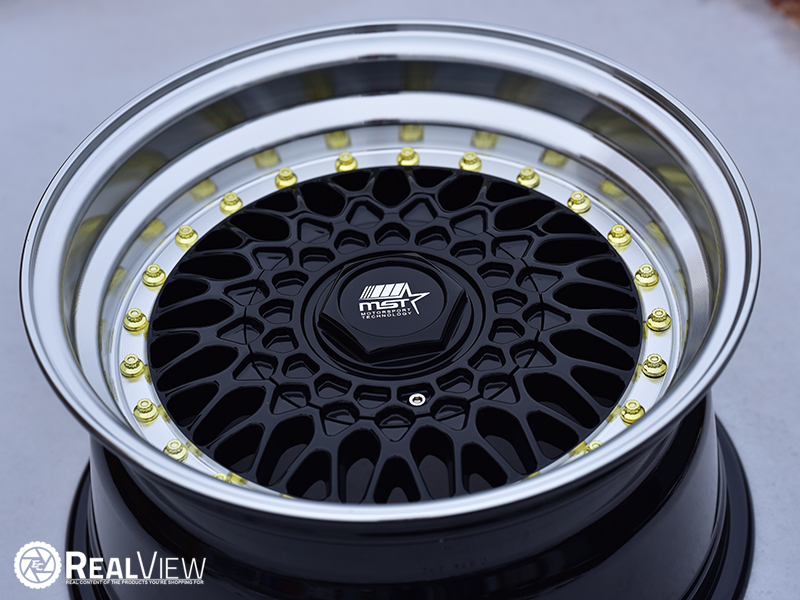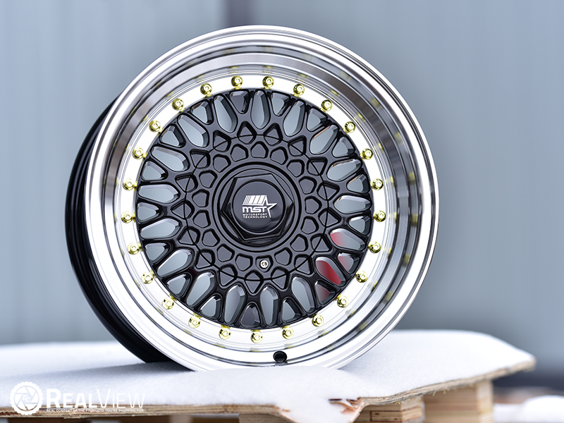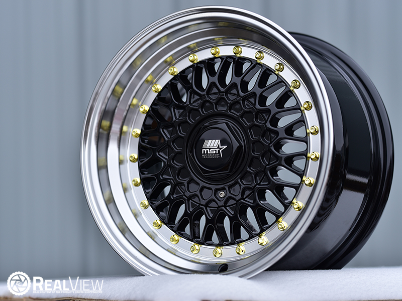 Black MST MT13 W/ Machined Lip and Gold Rivets Wheel (Series MT13). One Piece Aluminum. Open Lugs.