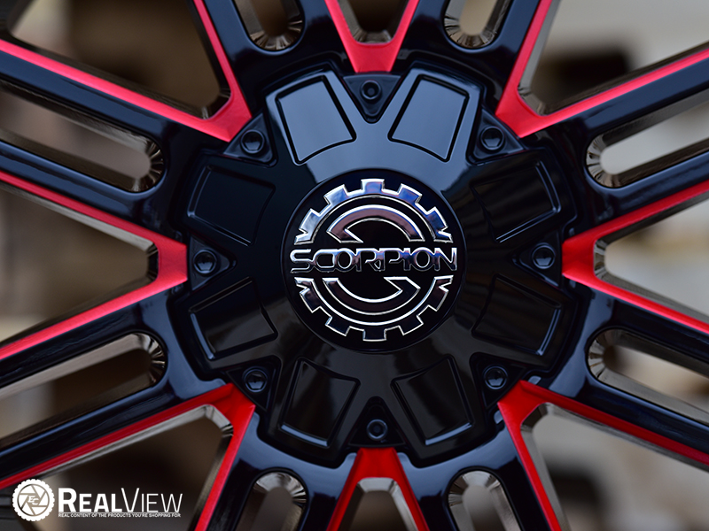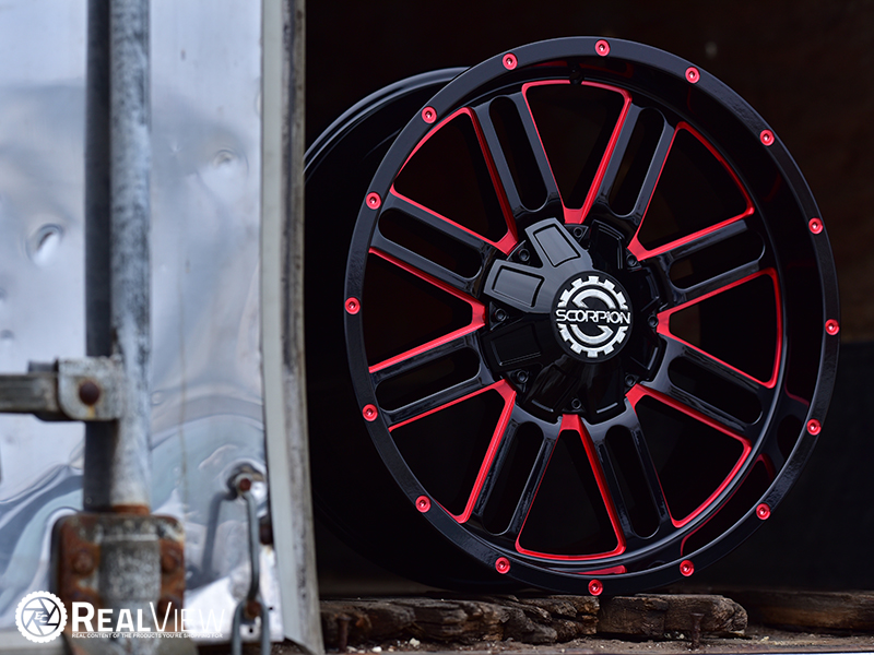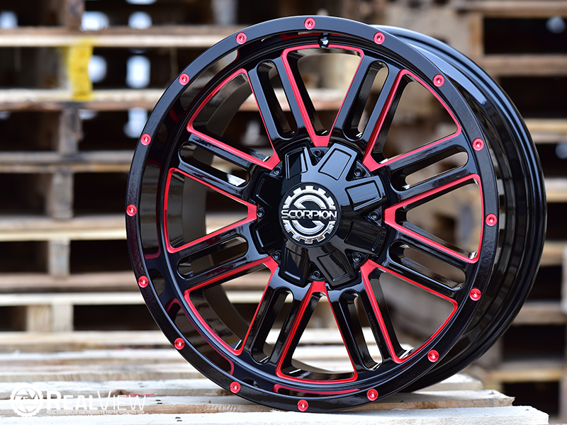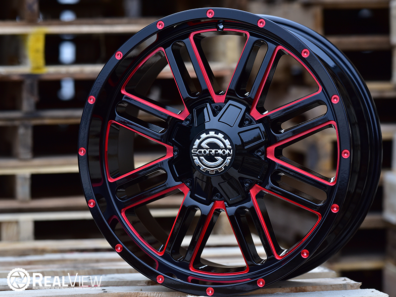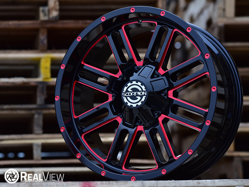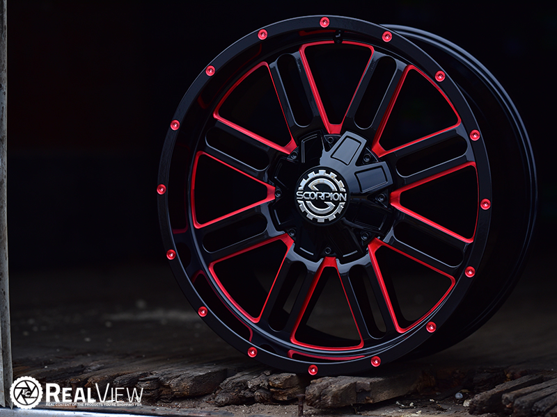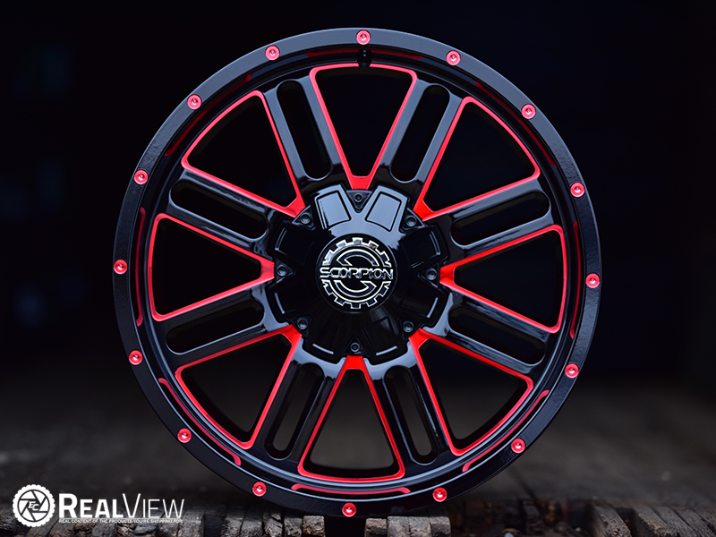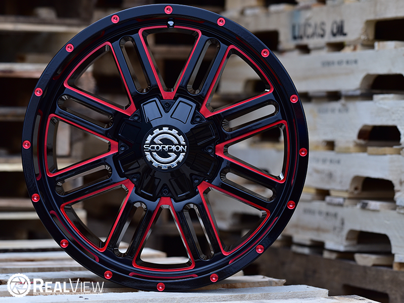 Red Milled Scorpion SC-18 Wheel (Series SC-18). One Piece Aluminum. Open Lugs.