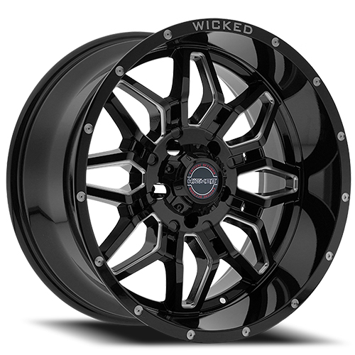 Gloss Black Milled Wicked W909B Wheel (Series W909B). One Piece Aluminum. Closed Lugs.
